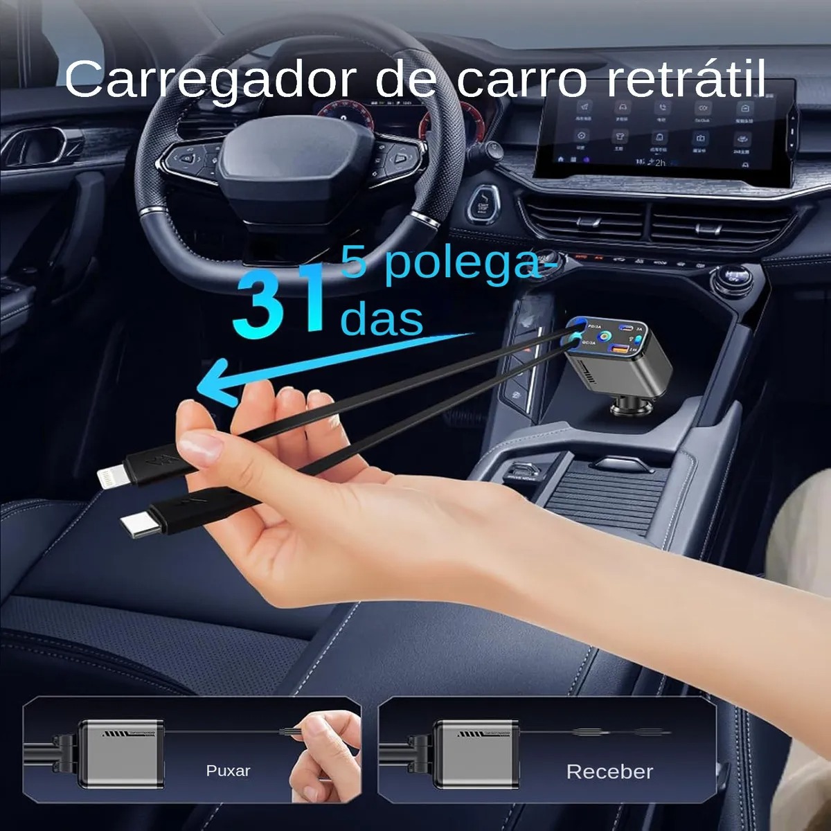 Os cabos retrataveis sao projetados para maxima conveniencia. Este carregador retratil para carro se estende por ate 80 cm, facilitando o acesso a qualquer dispositivo em seu carro. Apos o uso, eles se retraem automaticamente para evitar emaranhados e manter seu carro limpo.